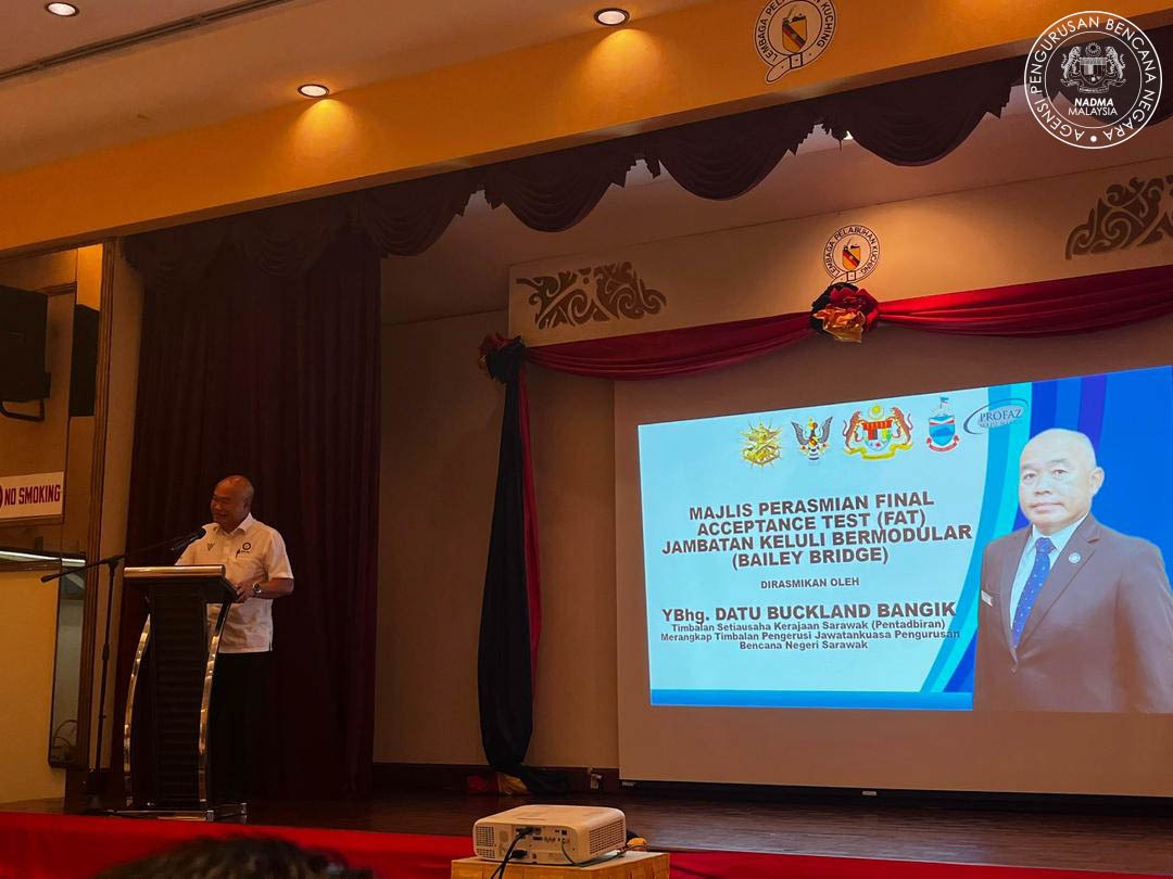 Telah berlangsung Majlis Perasmian Sesi Pemeriksaan Fizikal dan Latihan bagi Ujian Penerimaan Akhir (Final Acceptance Test – FAT) Jambatan Keluli Bermodular (Bailey Bridge) yang disempurnakan oleh YBhg. Datu Buckland anak Bangik, Timbalan Setiausaha Kerajaan Negeri Sarawak (Pentadbiran) merangkap Timbalan Pengerusi Jawatankuasa Pengurusan Bencana Negeri Sarawak.